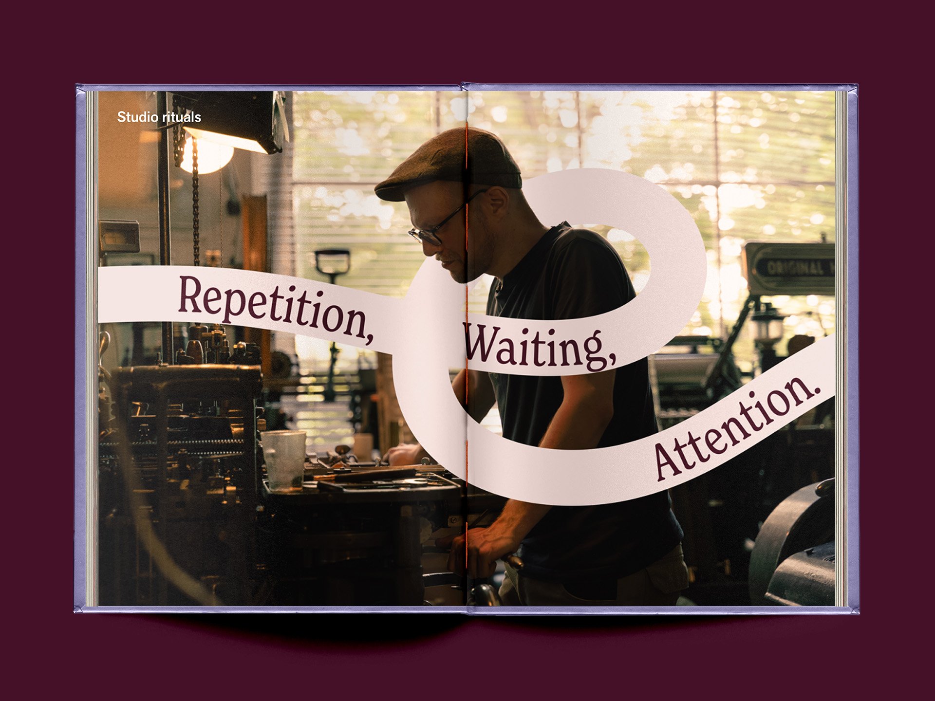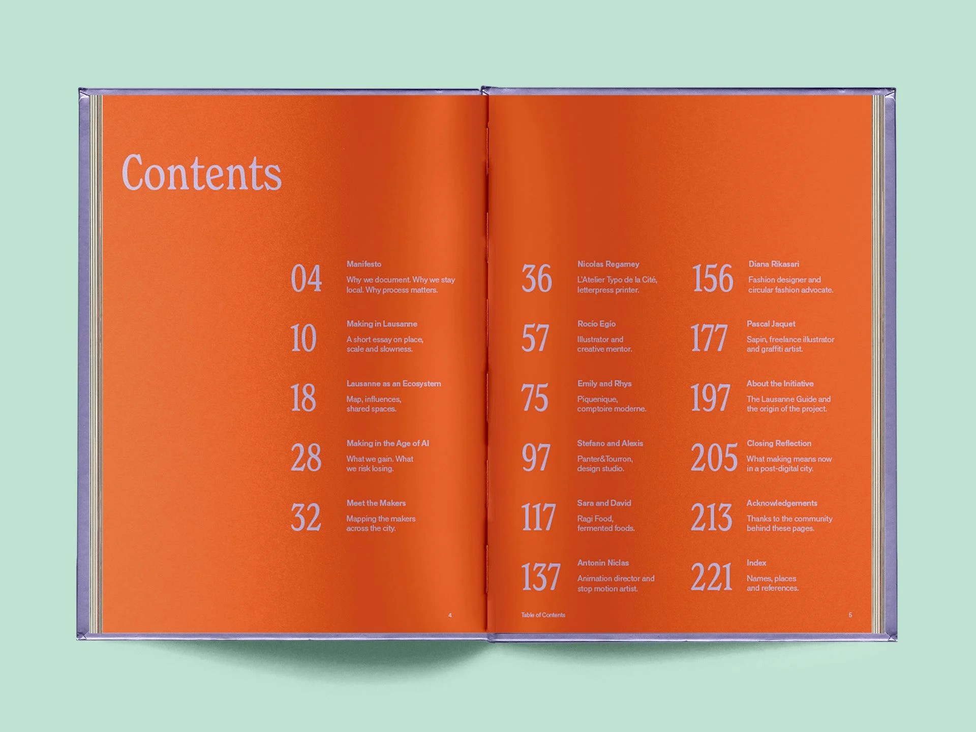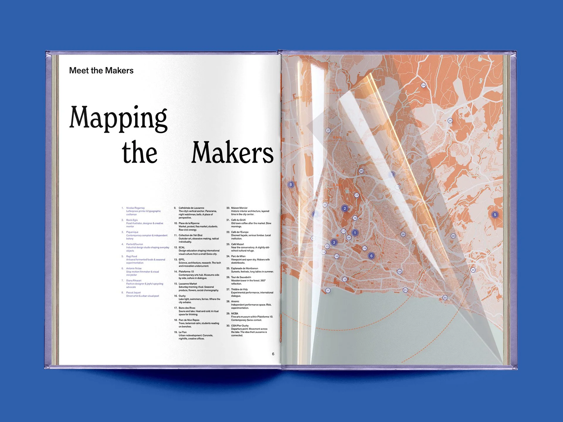 The book combines long-form interviews, portrait photography, studio rituals, tools and materials, process-based spreads, and information design focused on Lausanne’s creative ecosystem. Beyond documenting individual practices, it also builds a wider reflection on making today, on slowness, craft, locality, and the value of analogue gestures in a post-digital context.